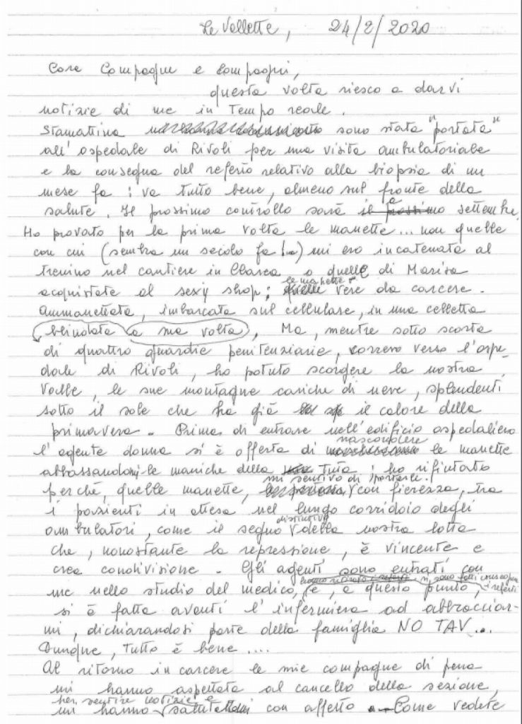Prima di entrare nell’edificio ospedaliero l’agente donna si è offerta di nascondere le manette abbassandomi le maniche della tuta; ho rifiutato perchè, quelle manette, mi sentivo di portarle con fierezza, tra i pazienti in attesa nel lungo corridoio degli ambulatori, come il segno distintivo della nostra lotta che, nonostante la repressione, è vincente e crea condivisione. Gli agenti sono entrati con me nello studio del medico, si sono fatti consegnare i referti, e a questo punto si è fatta avanti l’infermiera ad abbracciarmi, dichiarandosi parte della famiglia NoTav…