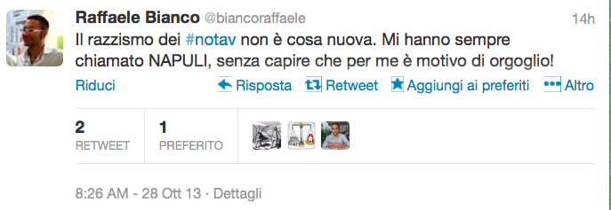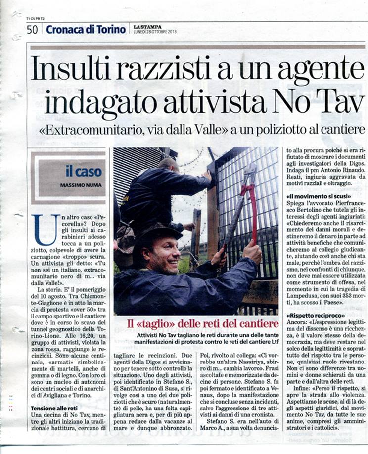 Ciao sono Stefano, vi scrivo in merito agli articoli comparsi in data odierna 28 ottobre 2013 sui quotidiani La Stampa e La Repubblica. Secondo quanto letto, avrei insultato il poliziotto in questione apostrofandolo con gli insulti “negro” ed “extracomunitario di m…”. Ma partiamo dall’ inizio. I fatti in questione fanno riferimento alla marcia over 50 tenutasi il 10 agosto 2013, che videro me e mio cognato prede di un aggressione da parte di personaggi in incognito privi di documenti identificativi, a bordo di un fuoristrada con vetri oscurati, i quali, rischiando di provocare un incidente per via di un sorpasso azzardato prima di una curva, dalla quale sopraggiungeva una vettura dal senso opposto, ci fermarono tagliandoci la strada intimandoci di scendere dalla macchina sforzando le portiere e battendo insistentemente i pugni sui vetri . Riconoscendo le persone viste poco prima all’interno del cantiere, scendemmo tranquillamente invitando gli individui a calmarsi e chiedendo il motivo di quanto stava succedendo. La loro reazione fu di piegarmi il braccio e sbattermi sulla portiera dell’ auto imprecandomii di stare zitto, di dare tutto quello che avevo, minacciandomi di morte e accusandomi letteralmernte di essere una mmmerda (il tutto mentre mi veniva strappato il portafogli dalla tasca). Mio cognato nel frattempo aveva consegnato, su richiesta, i documenti di sua spontanea volontà e dopo essere coperto anch’egli di insulti e sbattuto insieme con me contro il guard rail. Va ricordato che in macchina era presente anche mia suocera, la quale non era neanche stata notata e, anzi scese dalla vettura solo nel momento in cui apprese che volevano portarci via perchè riconosciuti dietro le reti durante la manifestazione e ricordo che disse : “Allora portateci via tutti perchè dietro le reti c’eravamo tutti!”. Nel frattempo si erano incolonnate parecchie auotomobili che avevano visto la scena, oltre ad alcuni abitanti che vista la scena erano accorsi in nostro aiuto provocando tempestivamente la fuga degli individui. Ora tornando all’articolo, va detto che anche per l’occasione (a ferragosto) era uscito un articolo con i nomi e cognomi per esteso di me e mio cognato, nel quale veniva reso noto che eravamo stati denunciati per danneggiamento e per non aver favorito i documenti alla digos. Com ‘è possibile che a noi le denunce non sono ancora arrivate? Ma soprattutto com ‘è possibile che i diretti interessati apprendano di essere stati denunciati leggendo fortuitamente un quotidiano?? Trovo ignobile inoltre essere accusato di razzismo, a me che viste le vicende che imperversano fanno venir voglia di andarmene dall’ Italia, la mia famiglia poi, che ha sempre fatto di tutto per aiutare persone di etnie diverse con problemi economici. Sfido questi inquisitori a fornirmi delle prove tangibili che dimostrino tali accuse, mosse a mio parere, solo per infangare il movimento, visti gli ultimi episodi mediatici che nelle ultime settimane hanno aperto uno spiraglio di luce.