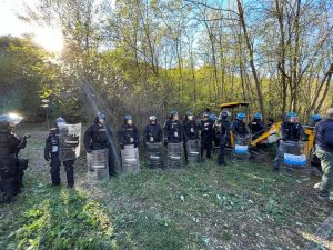 La notizia dell’imminente esproprio di quel pezzo di terreno era già nell’aria da giorni, per cui ieri mattina (giovedì 16 novembre) una trentina di attivist* NoTav si sono presentati sul posto, dove erano già presenti le forze dell’ordine, la Digos, il personale della TELT, e dove una ruspa aveva già fatto un grosso buco nel terreno.