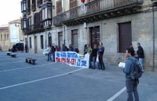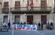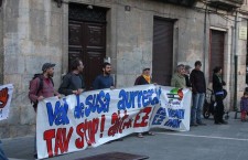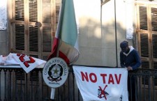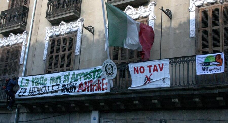 Striscioni in basco e italiano sventolano dal consolato italiano di Pamplona (Iruñea) in solidarietà con la Val Susa.