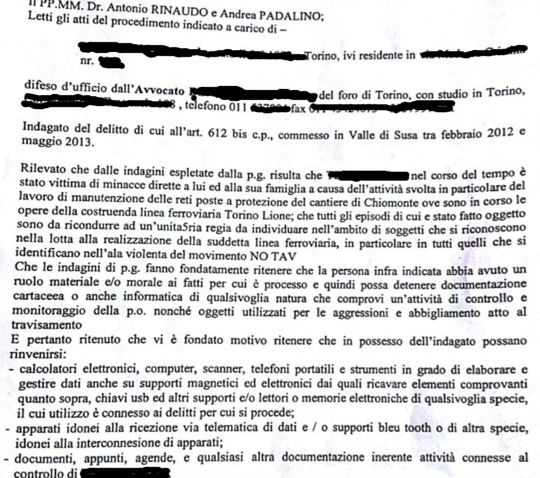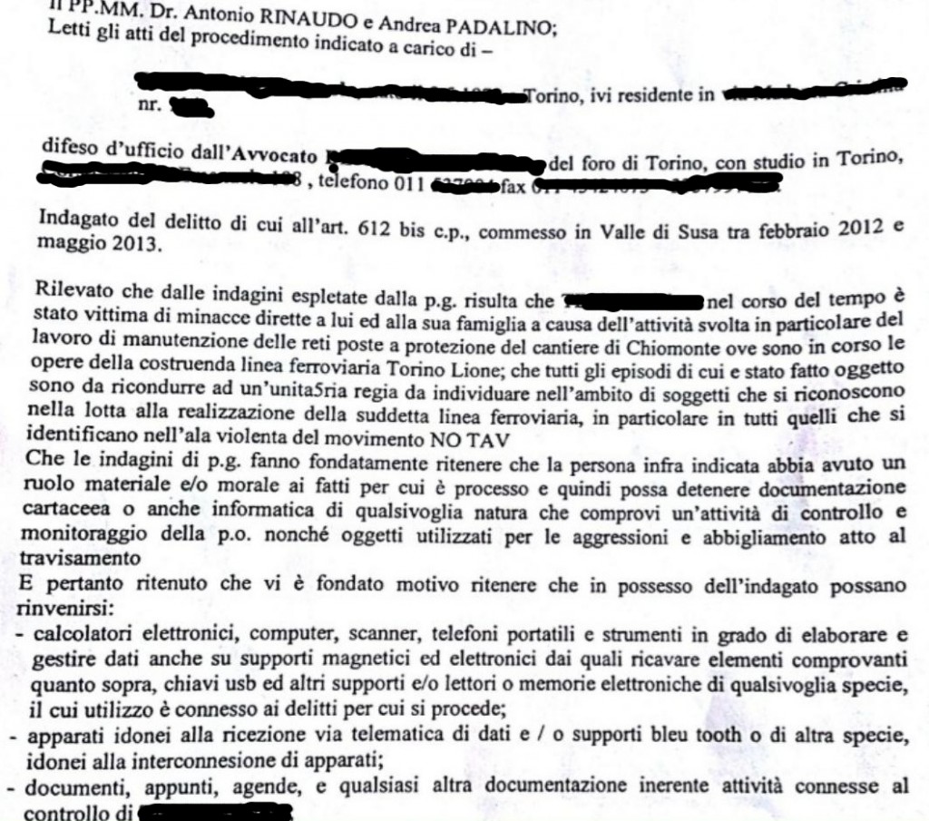Citiamo un passaggio significativo del decreto di perquisizione “che tutti gli episodi di cui è stato fatto oggetto sono da ricondurre ad un’unitaria regia da individuare nell’ambito di soffetti che si riconoscono nelal lotta alla realizzazione della suddetta liena ferroviaria, in particolare in tutti quelli che si identificano nell’ala violenta del movimento notav” e ancora “che le indagini di p.g. fanno fondalmentalmente ritenere che la persona infra indicata abbia avuto un ruolo materiale e/o moralea i fatti per cui è a processo…” e da qui il motivo del sequestro di computer, telefoni o abbigliamento.