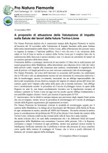 Pro Natura Piemonte deplora che il comunicato stampa della Regione Piemonte in merito all’incontro del 10 novembre sulla Valutazione di Impatto Sanitario della parte Italiana della tratta transfrontaliera della futura Torino Lione, abbia affermazioni che possono trarre in inganno la stampa e l’opinione pubblica. Non è vero che non vi sia variazione della salute in Val di Susa in merito ai cantieri della Torino Lione per il semplice fatto che la realizzazione della linea non è ancora iniziata e non vi è ancora un centimetro di tunnel od un cantiere operativo della linea stessa.