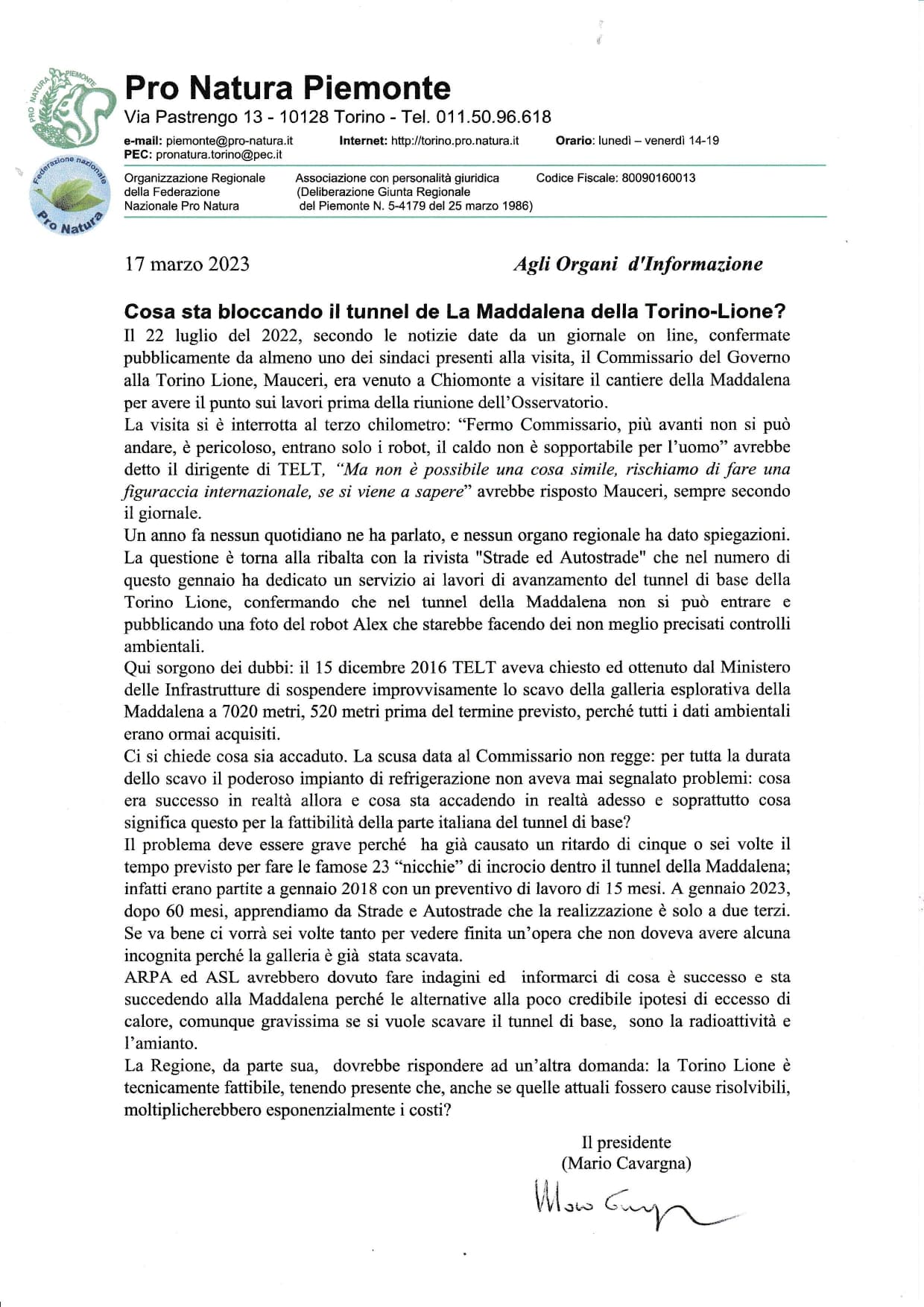 Di seguito il testo dei comunicato mandato agli organi di informazione, in cui Pro Natura Piemonte chiede conto dei ritardi del tunnel de La Maddalena.