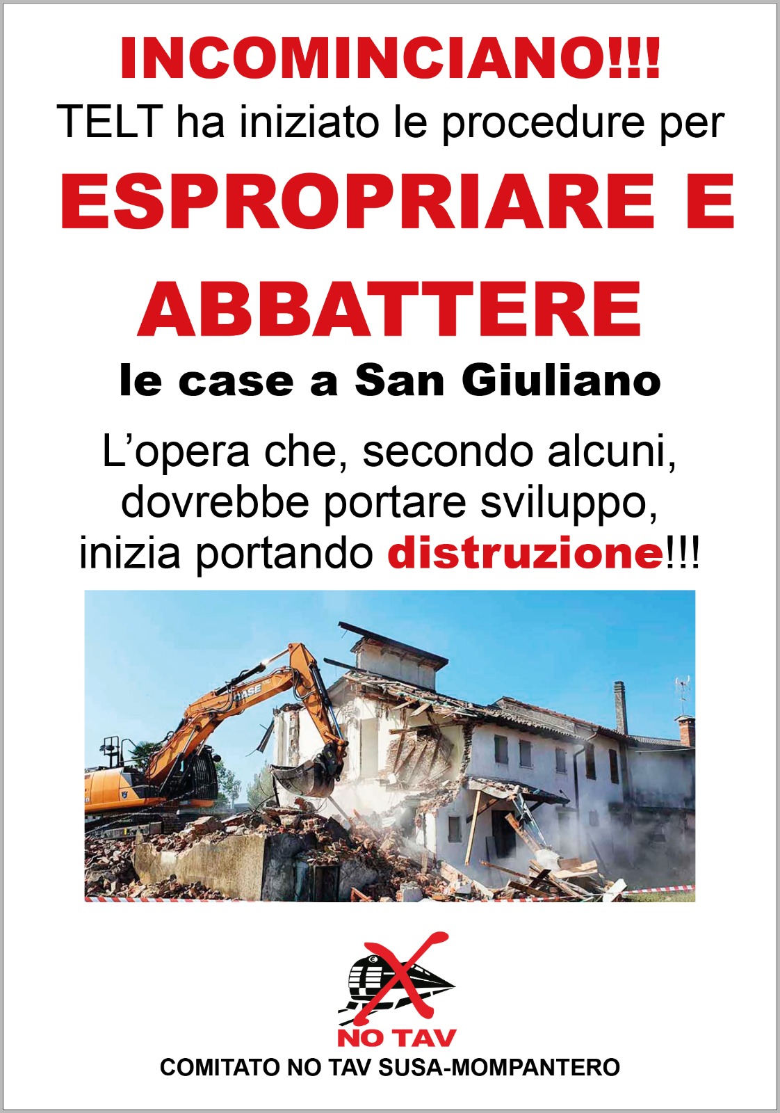 Questa notizia preannuncia l’inizio della distruzione nella piana di Susa, che partirebbe proprio da quelle due case, frutto di una vita di sacrifici, luogo dove sono nate e cresciute famiglie; queste abitazioni potrebbero essere abbattute dalle ruspe per far posto a un’inutile e fantascientifica “stazione internazionale”.