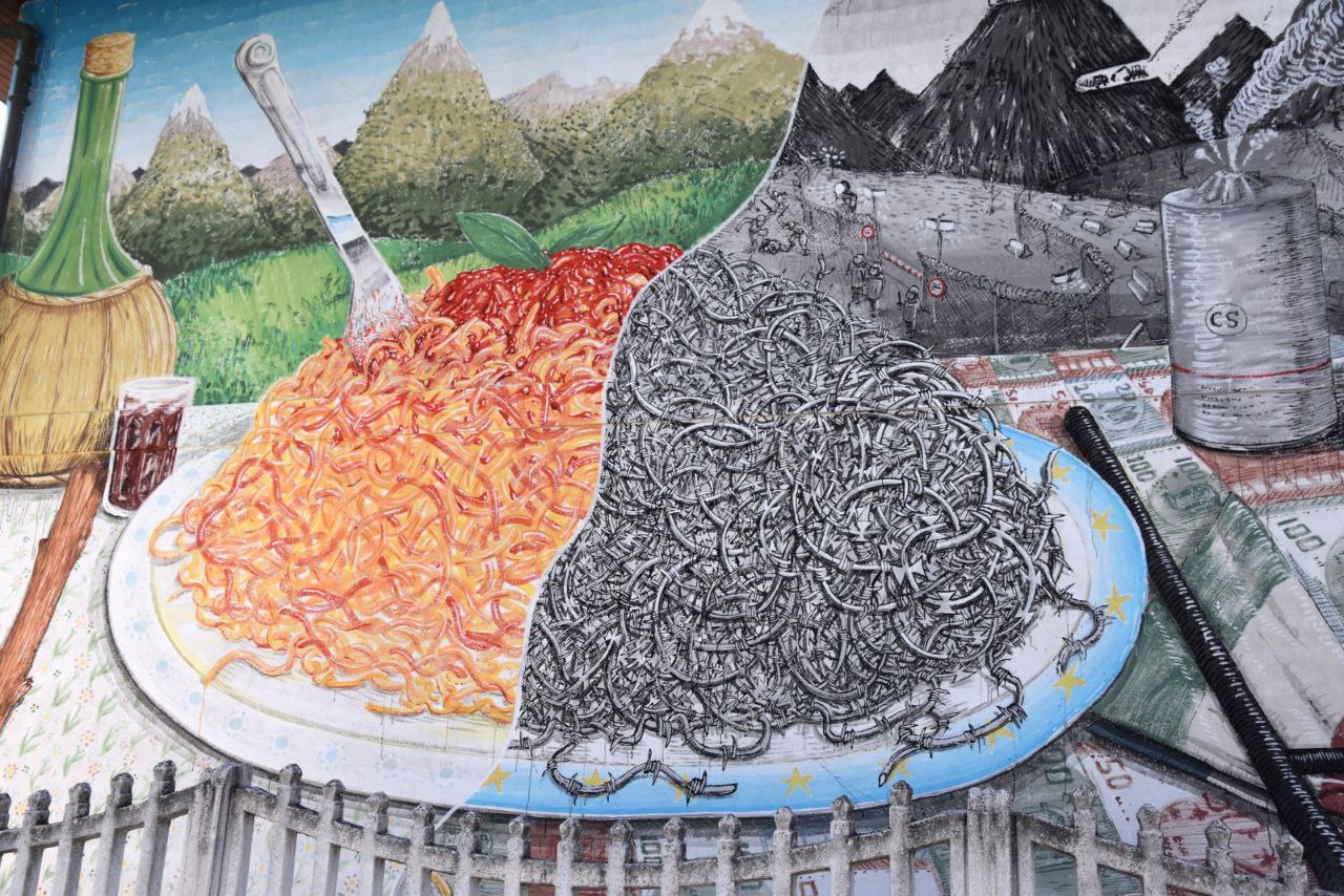 Il fiasco di vino generoso, la allegra convivialità della spaghettata mutano in orrido groviglio di filo spinato, la decorazione fiorita del piatto si corrompe in un inquietante blu-polizia, mentre il bicchiere diventa lacrimogeno, e la linda tovaglia da scampagnata uno spesso, lercio strato di euro: il prezzo di una vita in vendita e di una morte in ginocchio.
