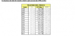 Tenete conto che i dati anomali del periodo 1999-2004 sono dovuti alla chiusura del tunnel del Monte Bianco, dopo la tragedia del 1999 e la riapertura nel 2002[1]. Come vedete, da quel momento c’è un inesorabile ritorno ai valori, che questo punto dobbiamo considerare fisiologici, del 1998 pre-incendio. Meno di 800.000 veicoli all’anno, che ne fanno – secondo le cronache locali del 2007 – un’autostrada inutile: “…viene fuori la conferma che l’autostrada della valle di Susa è una delle meno frequentate dai TIR. Se paragonato al traffico pesante, che secondo Anas paralizza i tratti più intasati della rete autostradale del nord Italia (Milano-Bergamo sulla Serenissima e Modena-Bologna sull’Autofiori) l’Autofrejus è quasi un’autostrada inutile. Nella mappa dei flussi dei TIR dove le autostrade sono disegnate più spesse e con colori vivaci a seconda di quanti TIR ospitano, l’A32 quasi non si vede. Una conferma l’abbiamo tutte le volte che percorriamo l’autostrada nei giorni feriali. Effettivamente durante il giorno, da Avigliana al Frejus, di TIR se ne vedono veramente pochi: in un’ora, venerdì mattina, una trentina quelli in transito e una ventina in attesa del passaggio nel tunnel”. Luna Nuova del 9/2/07, Massimlliano Borgia, pag. 3.