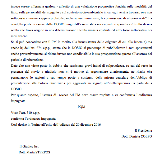 Ci hanno lavorato così a fondo, motivando il tutto in un documento più politico che giudiziario, che sono arrivati fino all’udienza di ieri, che ancora una volta, come avvenne qualche giorno fa, un giudice (3 per l’occasione) non ha avallato: “Dato che non viene posto in dubbio che sussistano gravi indizi di colpevolezza, su cui del resto in presenza del rinvio a giudizio non vi è motivo di argomentare ulteriormente, ne risulta che permangono le ragioni a suo tempo poste a sostegno della misura cautelare dell’obbligo di presentazione alla Polizia Giudiziaria poi aggravata in seguito all’inottemperanza da parte della DOSIO”.