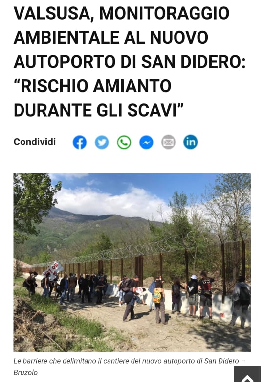 Telt e Virano da anni sulla vicenda dell’amianto ne sparano una più grossa dell’altra. Adesso emerge che a quanto pare nel nuovo cantiere-fortino di San Didero potrebbe esserci “l’eventualità di rinvenimento di trovanti e blocchi di meta-ofioliti durante le opere di scavo”. Sitaf, responsabile della costruzione dell’autoporto, infatti ha pubblicato il bando di gara per il “Piano di Monitoraggio Ambientale relativo alle componenti che risultano potenzialmente interferite dalla realizzazione del nuovo Autoporto in Comune di San Didero e Bruzolo e della connessa viabilità di svincolo autostradale”. Si tratta di lavori dal costo totale stimato di 632.620 euro (Iva esclusa)L’area, già pesantemente inquinata dal PCB e dalle diossine emessi dalle acciaierie e da sversamenti di rifiuti tossici, potrebbe nascondere sotto il terreno rocce amiantifere. Telt negli anni si era sperticata nel dire che le concentrazioni di amianto riguardavano principalmente il monte Musinè (che proprio per questo escluso dal tracciato), per poi suo malgrado ammettere che anche nella zona del massiccio dell’Ambin e nei pressi di Susa, nell’area che dovrebbe essere coinvolta dallo scavo, secondo i carotaggi ne sarebbe stata rintracciata una significativa presenza. Il movimento No Tav invece è trent’anni che dice che in Val di Susa la presenza di rocce amiantifere è molto più diffusa.