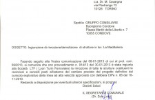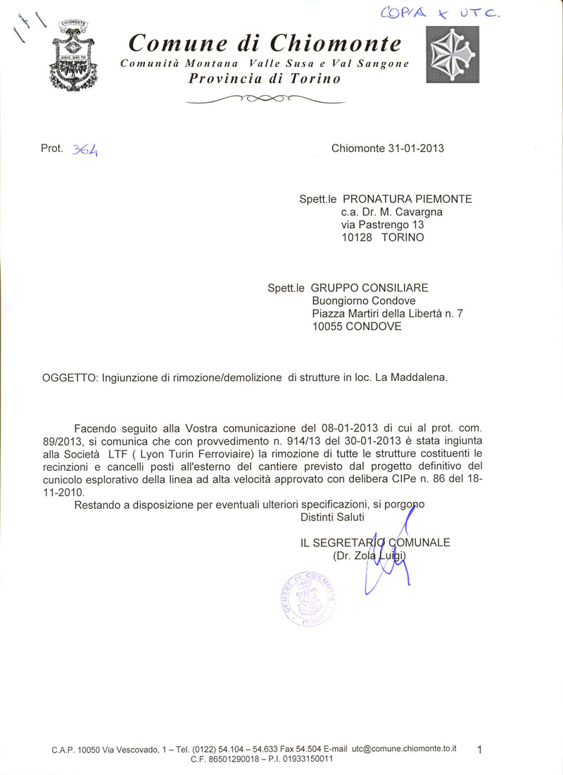 L’ingiunzione del Comune di Chiomonte ad LTF di rimuovere/abbattere tutte le recinzioni, i cancelli e quant’altro costruito al di fuori dell’area del cantiere per il tunnel geognostico della Maddalena così come definita dal CIPE (quindi rimuovere/abbattere tutte le recinzioni dell’area del museo dell’azienda agricola e dell’area archeologica, il cancello della Centrale, le reti alla Centrale, le reti all’altezza delle “vasche” comprendendo anche l’attuale accesso diretto dall’A32), è un atto dirompente dalla straordinaria importanza e che segna uno spartiacque rispetto all’atteggiamento che i Comuni hanno sinora avuto nei confronti delle problematiche TAV, aspetto questo ultimo che assume ancora più forza essendo l’amministrazione di Chiomonte favorevole al TAV.