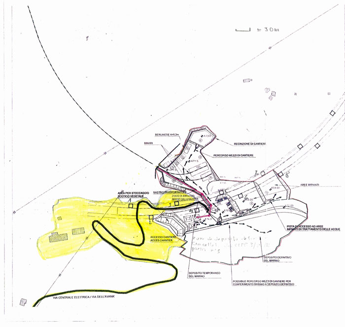Nella cartina in giallo le aree attualmente circondate dalle recinzioni, che secondo la legge, dovrebbero divenire nuovamente accessibli al netto di eventuali pretettate. Da notare che la superficie di circa 29.000 metri quadri è quasi equivalente a quella del cantiere vero e proprio (32.000 metri quadri), in altre parole l’area recintata si è quasi dimezzata.