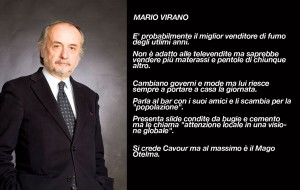 E’ probabilmente il miglior venditore di fumo degli utlimi anni. Non è adatto alle televendite ma saprebbe vendere più materassi e pentole di chiunque altro. Ha il vizio di nascondersi sempre e ripetere (e scrivere) castronerie all’infinito che nel tempo diventano realtà perchè ha tante penne compiacenti. Ricopre tre incarichi contemporaneamente e non si stressa mai. Cambiano governi e mode ma lui riesce sempre a portare a casa la giornata. Parla al bar con i suoi amici e li scambia per la “popolazione”. Presenta slide condite da bugie e cemento ma le chiama “attenzione locale in una visione globale”. Si crede Cavour ma al massimo è il Mago Otelma.