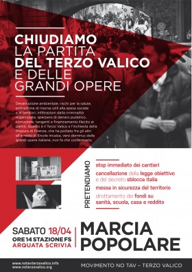 Chiediamo a tutte e tutti di partecipare alla marcia popolare che svolgeremo ad Arquata Scrivia (AL) sabato 18 aprile con ritrovo alle ore 14 presso la stazione FS. Una grande marcia pacifica per le vie del paese che vogliamo veder attraversato insieme da anziani, adulti, giovani e bambini.