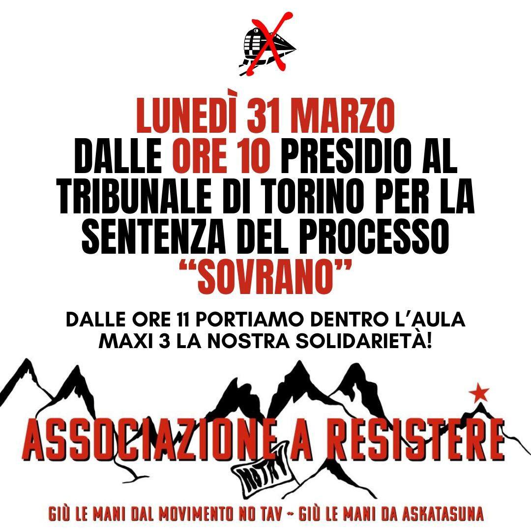 Lunedì 31 marzo ci sarà la sentenza del Processo Sovrano che vede 28 imputati di cui 16 accusati di associazione a delinquere, compagni e compagne che da decenni si spendono nelle lotte e partecipano alle esperienze politiche e sociali di Askatasuna, Movimento No Tav e Spazio Popolare Neruda.