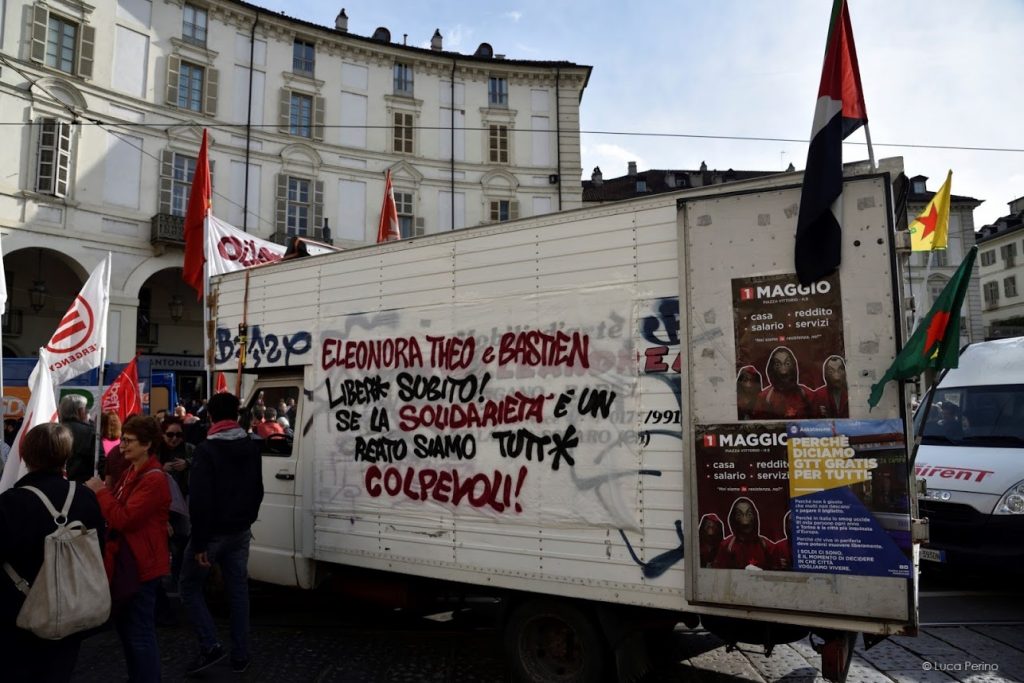 Le due cose non sono mai giunte in piazza perchè la digos, ha fatto di tutto per non farle giungere al presidio, fermando il furgone in Valle, portandolo in questura con la scusa di avere alla guida Giorgio, al quale doveva essere fatta una notifica perchè soggetto a dover scontare degli arresti per le condanne inflittegli (con la solerte generosità del tribunale di Torino) per le manifestazioni degli anni scorsi.