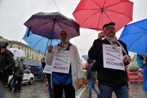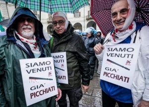 L’oggi ci rimanda una fotografia di presidi attivi, la presenza e partecipazione importante di giovani. Ma l’età avanza e alla fine uno si scoccia di prendere sempre manganellate. L’idea per evitare che venisse mantenuta e ripetuta la ormai pluriennale tradizione del 1° Maggio che vedeva impedito ai No Tav e ad alcuni spezzoni sociali di corteo l’entrata in piazza San Carlo, a Torino? Alcuni Notav si sono presentati con bende, fasciature e cerotti e la scritta sul petto e sulla schiena: “Siamo venuti già picchiati” grazie.