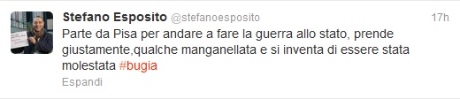 Esposito aveva infatti iniziato a commentare i fatti con questo bel “parte da Pisa per andare a fare la guerra allo stato, prende giustamente qualche manganellata e si inventa di essere stata molestata, bugia” su twitter,