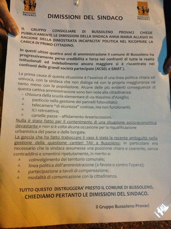 ndr: il volantino qui sotto e la richiesta di dimissioni è stata presentata dalla Lista Bussoleno Provaci che ha “perso” le elezioni per 4 voti