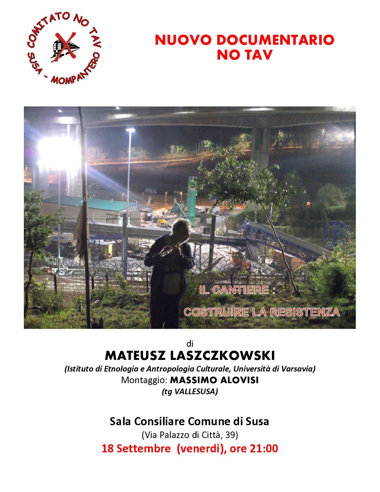 Venerdì 18 settembre alle ore 21.00 in sala consiliare presso il Comune di Susa , siete tutti/e invitati/e alla proiezione del nuovo docu-film di Mateusz Laszczkowski ( antropologo dell’Università di varsavia ) sul Movimento No TAV