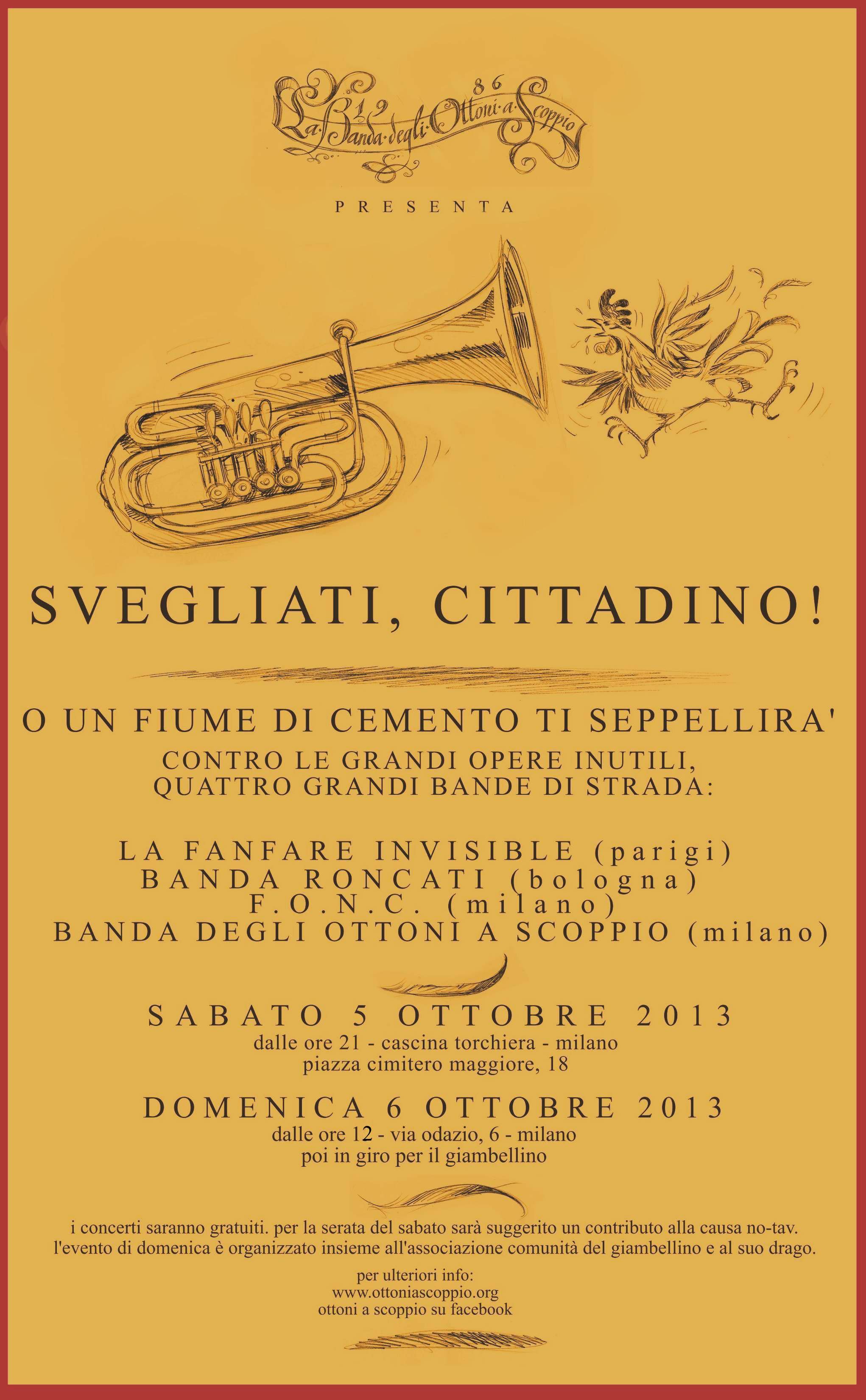 La benemerita Banda degli ottoni a scoppio di Milano organizza per sabato 5 e domenica 6 ottobre una sbandata musicale per le vie di Milano. Temi portanti saranno incursioni musicali a sorpresa, serata benefit pro No Tav alla cascina Torchiera e parata musicale al quartiere Giambellino a fianco del DRAGO.Ospiti d’onore la banda parigina La Fanfare Invisible.