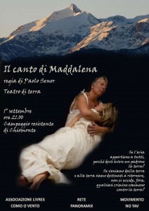 Lo spettacolo fonde il rituale della sacra rappresentazione con quello delle tante manifestazioni colorate, nonviolente e straordinariamente partecipate che in questi ultimi anni hanno attraversato la valle, riempiendo esteticamente le stesse degli elementi – memoria, resistenza, passione, ma anche capacità di guardare al futuro con occhi nuovi – che muovono questa terra. Terra che viene incarnata dai corpi delle donne, creative protagoniste del movimento di opposizione all’Alta Velocità come dello spettacolo. Una rappresentazione che utilizza linguaggi fortemente evocativi, come la danza e il teatro-immagine, la testimonianza, la narrazione poetica e la musica dal vivo, solcando le piazze e le strade dei centri storici o i sentieri della valle. Unendo tutti, attori e spettatori, in un rituale di collettivo riconoscimento delle radici comunitarie.