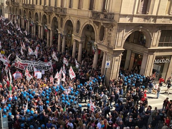 Questa evidenza probabilmente non poteva essere tollerata. Già dai giorni prima della manifestazione era evidente che si sarebbe tentato di relegare le voci di dissenso lontane dai responsabili delle politiche sociali, ambientali e sindacali che hanno falcidiato territori e generazioni di giovani e meno giovani del nostro paese. La polizia ha più volte tentato di bloccare lo spezzone sociale, di costringerlo al fondo del corteo, di provocarne il ridimensionamento, ma i numeri sono cresciuti, così come la determinazione e la volontà di portare avanti le proprie rivendicazioni. Nonostante tre violente cariche il corteo è arrivato in piazza San Carlo e finalmente la voce del paese reale ha potuto esprimersi su quel palco che fino a pochi minuti prima era stato il teatro della sfilata politico-sindacale.