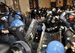 “I manifestanti, senza alcun oggetto contundente, senza elmetti, senza essere mascherati, si sono intrattenuti per circa un’ora alla trivella, leggendo comunicati e documenti sulla TAV, sotto gli occhi delle forze dell’ordine. Poi all’improvviso le due vie di accesso, due stradine nei campi, sono state chiuse da Polizia e Carabinieri, che hanno intimato al gruppo di sciogliersi. In pochi minuti – ci raccontano due testimoni del paese – hanno spinto i manifestanti contro un muro, ed è partita la carica a manganellate da parte della Polizia e dei Finanzieri. (N.d.r. che farebbero bene a occuparsi dei miliardi degli evasori alle Seychelles, per esempio) Una carica a freddo, senza apparente motivo, per una manifestazione che era stata pacifica e tranquilla. “