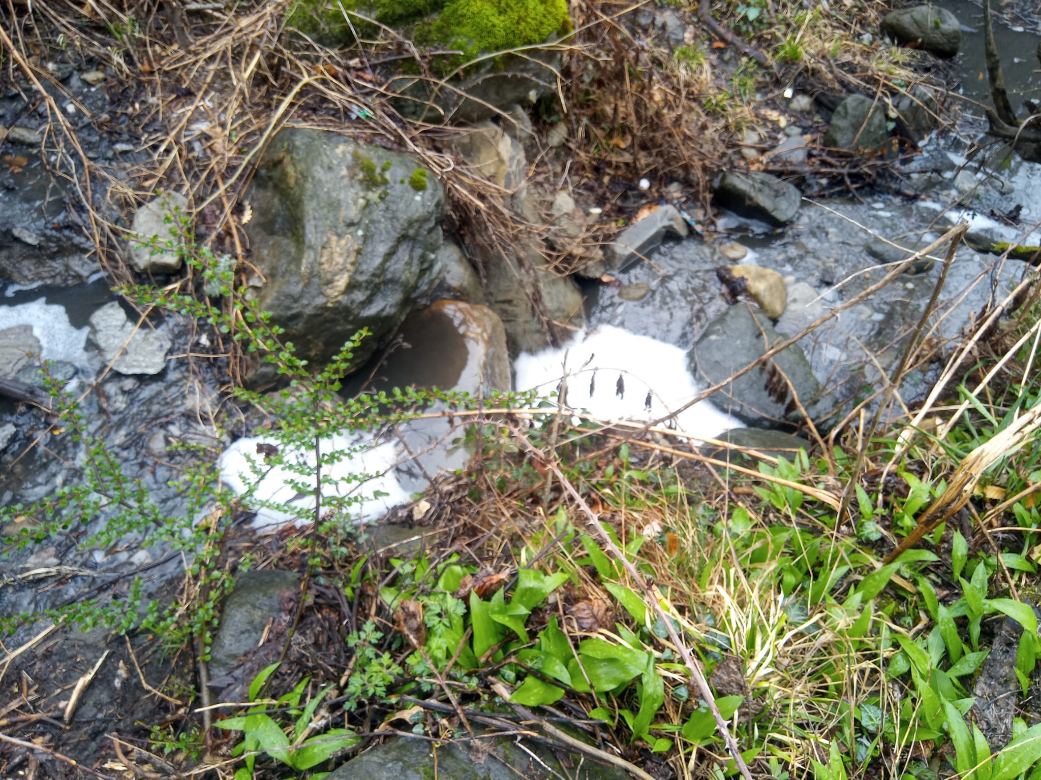 Domenica 26 marzo, mentre pulivamo i terreni che si trovano intorno al Presidio dei Mulini, abbiamo visto uscire da un grande tubo in cemento posto sotto il sentiero, poca acqua con abbondante schiuma bianca, liquido non naturale in un rio boschivo.