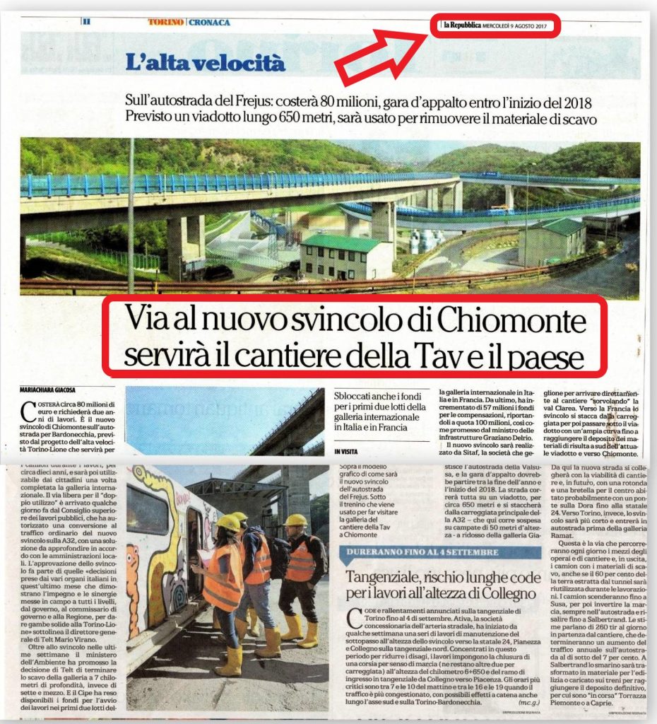 “Via al nuovo svincolo di Chiomonte, servirà il cantiere della TAV e il paese”. Lo dice la Repubblica il 09 agosto del 2017, 6 (sei) anni fa. Ne fa una mirabolante descrizione, snocciolando anche dati relativi agli appalti necessari e al costo previsto.