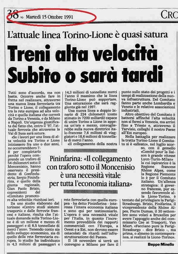 Era 15 ottobre del 1991, 32 (trentadue) anni fa e Pininfarina sulle pagine dei giornali gridava quanto fosse imminente il collasso della linea ferroviaria esistente. Non solo non è collassata ma i traffici sono diminuiti e adesso i treni ad alta velocita collegano Torino alla Francia attraverso il Frejus.