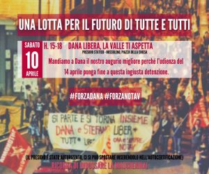 Sabato 10 aprile, dalle ore 15 alle ore 18, saremo in presidio in Piazza Cavour a Bussoleno (piazza della chiesa) per un pomeriggio all’insegna dell’allegria e del buon umore, per mandare a Dana tutto l’augurio da parte del Movimento No Tav in vista dell’udienza del 14 aprile che ancora una volta vedrà il Tribunale di Sorveglianza di Torino decidere sulle sorti di Dana.