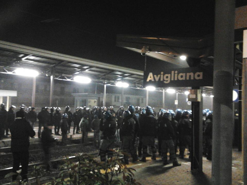ore 2.30 Avigliana il trasporto radioattivo passa,dopo che la polizia sgombera i manifestanti dai binari,risultano due feriti lievi (un ragazzo colpito al naso da uno scudo,e una signora colpita allo stomaco) e numerosi compagni colpiti da calci…