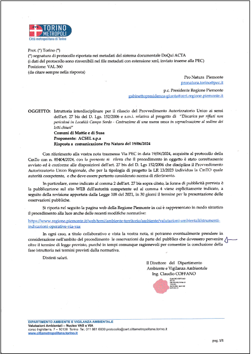 Per quanto riguarda il contenuto della loro lettera: l’articolo 27 citato riguarda il decreto che conclude la VIA cioè quello che qui giustamente chiama Provvedimento Autorizzativo Unico Regionale. Che è una cosa che deve venire alla fine. Ma noi abbiamo contestato la mancata pubblicazione su di un giornale del deposito della documentazione progettuale da cui partono i termini per fare delle osservazioni.