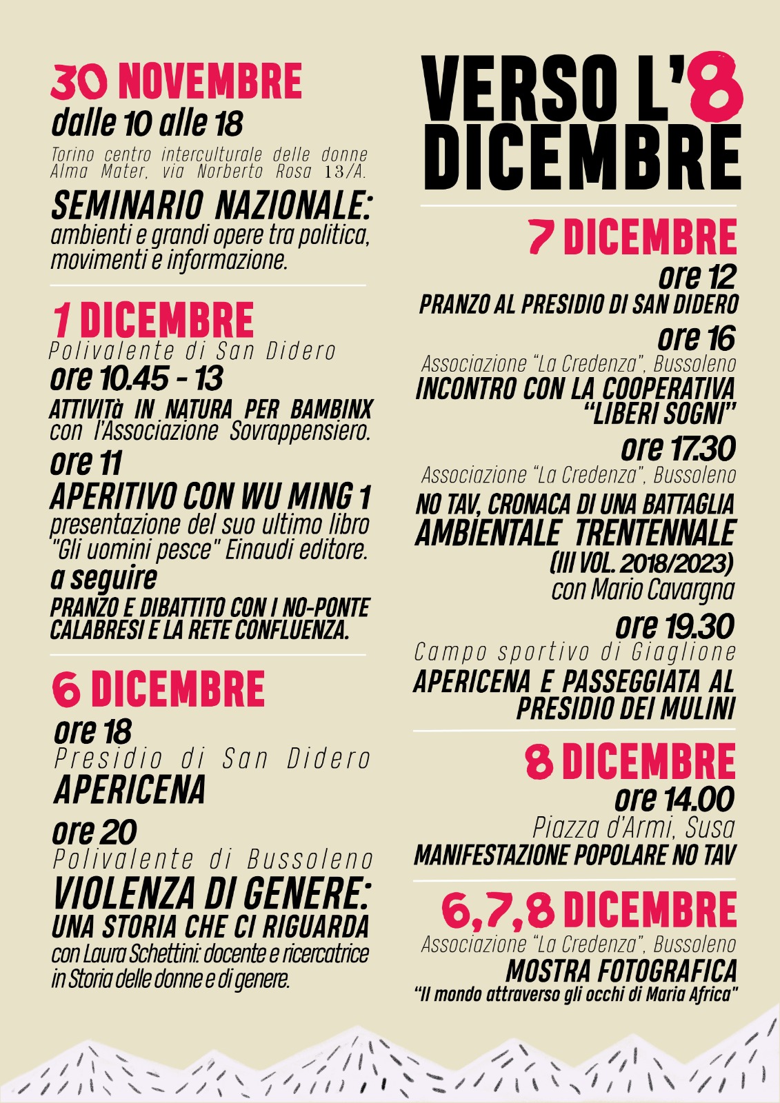 A partire dalla fine di novembre la Valsusa e Torino saranno animati da iniziative, eventi e momenti di socialità che ci accompagneranno verso la manifestazione popolare dell’8 dicembre a Susa.