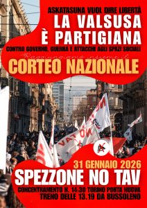 Come Torino, anche la Valsusa è partigiana: lo è per storia, memoria e pratica quotidiana di resistenza. Il 31 gennaio saremo in piazza con determinazione e rabbia, contro il governo, contro la guerra e contro l’attacco agli spazi sociali. La Val di Susa, partigiana ieri come oggi, porterà per le strade della città la sua storia di lotta: una valle che non si piega, che difende la terra e la libertà con la forza di chi sa da che parte stare.