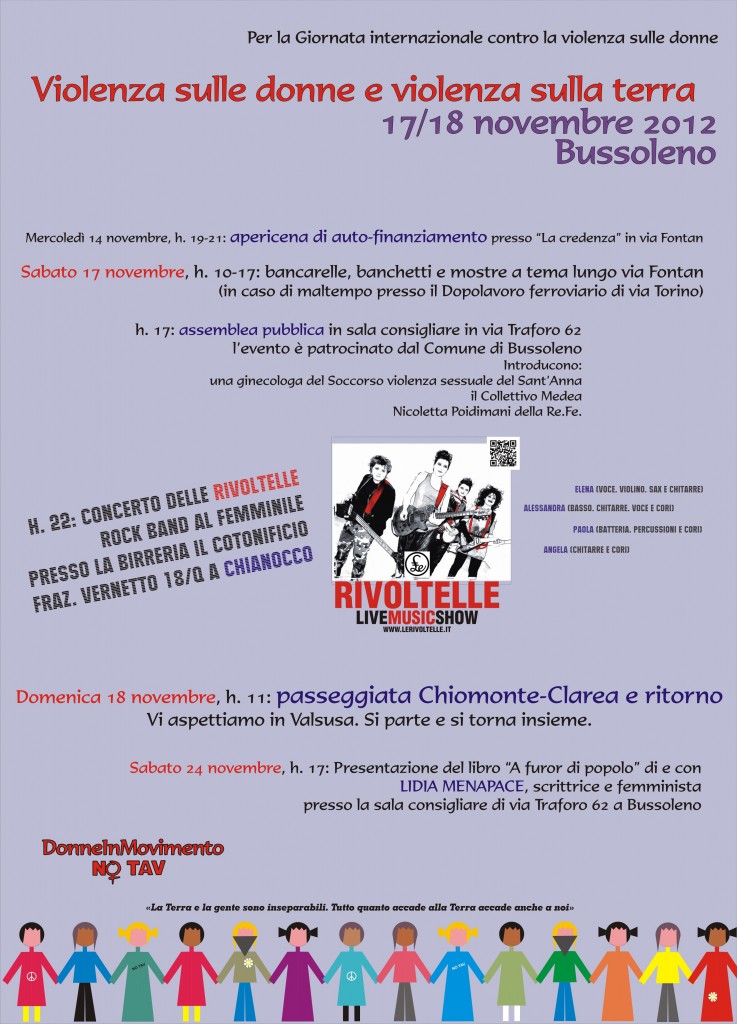 – ore 17.00 – Bussoleno – Sala Consigliare, Via Traforo 62: Assemblea Pubblica; interverranno: Nicoletta Poidimani di RE-FE (Relazioni Femministe); Collettivo Medea; Elina Colongo, Soccorso Violenza Sessuale Ospedale S. Anna di Torino.