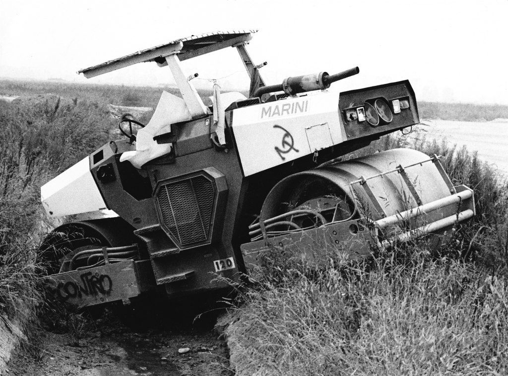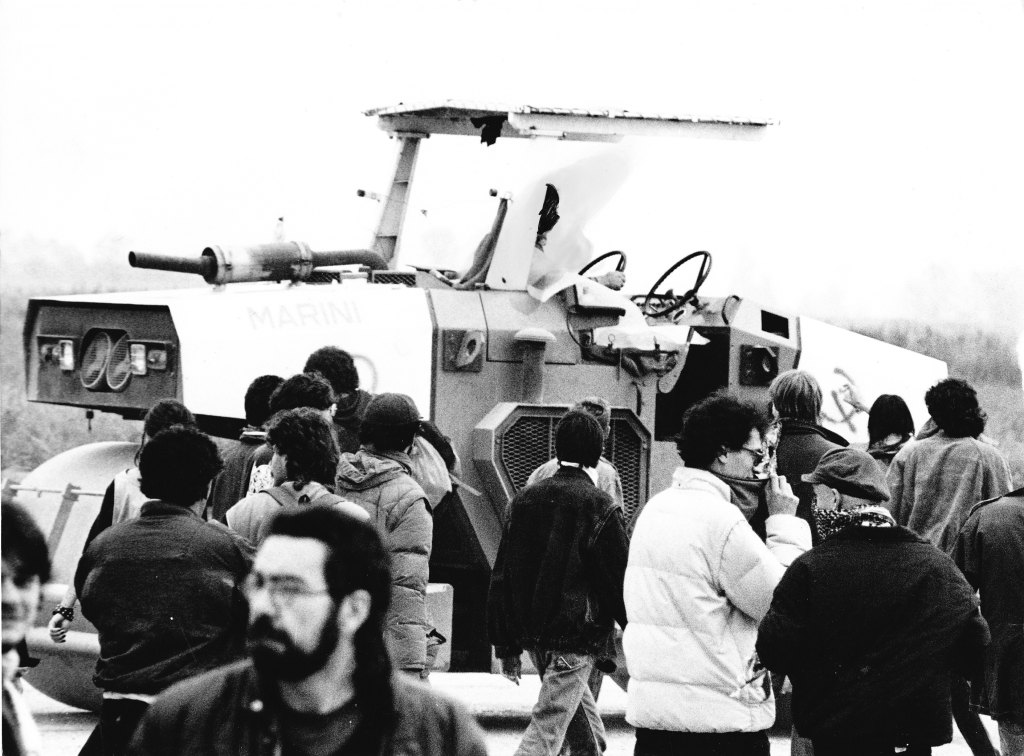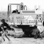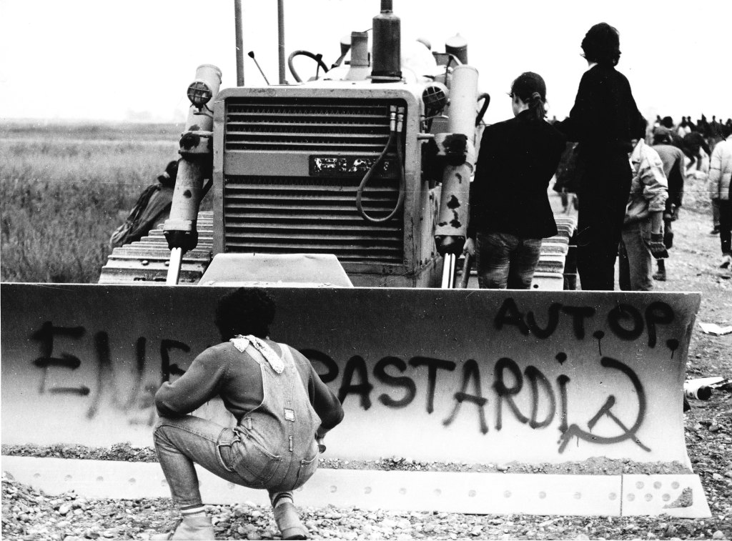 Il 10 ottobre 1986 vennero organizzate in contemporanea in diverse località italiane delle marce antinucleari, che avevano come obiettivo il blocco dei lavori all’interno dei vari cantieri. A Trino vercellese ci fu il salto di qualità. Una parte consistente dei manifestanti non si accontentò del semplice blocco, ma entrò direttamente nel cantiere, occupandolo. Ruspe e altri macchinari furono danneggiati e messi fuori uso. I danni furono calcolati in 500 milioni di lire di allora. Il movimento aveva dato un segnale preciso: non erano più sufficienti l’azione simbolica, il gioco della mediazione, la semplice testimonianza. Occorreva agire direttamente, impedendo nei fatti il proseguimento dei lavori. Il governo e tutti quanti avevano interessi nell’affare nucleare dovevano sapere che se avessero continuato coi loro propositi avrebbero dovuto fare i conti con un’opposizione sociale sempre più consapevole e determinata. E questo nonostante l’opera di “pompieraggio” svolta dalle componenti istituzionali del movimento, che – ieri come oggi – fecero di tutto per riassorbire all’interno di percorsi di delega e rappresentanza le spinte di cambiamento e trasformazione che provenivano dalle lotte. Di seguito riportiamo alcuni stralci di documenti dell’epoca, pubblicati come supplemento alla rivista Rosso Vivo, n. 6. Inoltre, pubblichiamo la scansione delle foto originali dell’epoca, a suo tempo causa di diversi ordini di perquisizione nei confronti di alcuni compagni e di alcune sedi di collettivi politici dell’autonomia.