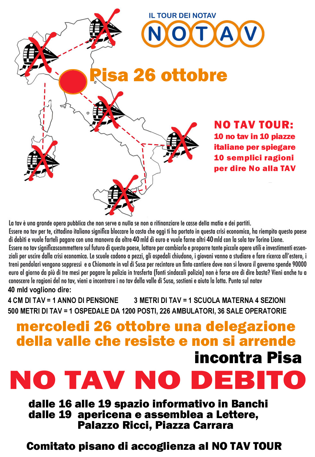 Arriva un tranquillizzante messaggino di Alessandro e Gianni che sono rientrati a casa dopo un viaggio notturno assai faticoso sotto la pioggia battente e con un pesante prolungamento dettato dalla necessità di passare da Firenze- Bologna a causa della chiusura dell’ autostrada e anche della Cisa, . Simone viene a prendermi e insieme ad altri ragazzi del centro sociale Nebroz giriamo per Pisa, raccontandoci reciprocamente le nostre esperienze: loro sono molto impegnati sul fronte del diritto alla casa, della difesa dei migranti, oltre che su quello del sostegno alla nostra lotta. Arriva l’ora di montare il presidio in piazza di fianco al Comune, mentre Ezio e Tommaso arrivano con due ore di ritardo sempre a causa delle interruzioni che la pioggia ha provocato anche sulla ferrovia: il pensiero che la vera grande opera in Italia sarebbe quella di occuparsi del dissesto idrogeologico trova continue conferme. Il presidio in piazza risulta grande e partecipato. Il nostro banchetto offre gadget di ogni genere accanto a libri e documentazione e tutto viene “preso d’ assalto†. Con il preziosissimo aiuto delle amiche pisane funziona alla grande, mentre sul computer girano i filmati, intervallati da nostri brevi interventi che vengono seguiti con attenzione e interesse da un pubblico numeroso. Si prosegue spostandoci alla facoltà di lettere dove i ragazzi hanno organizzato una cena di finanziamento i cui proventi devolvono al nostro tour con un’ennesima prova di generosità e vera condivisione. Intanto sullo schermo continuano a girare i filmati. Alle 21,30 inizia l’assemblea che vede la partecipazione di un centinaio di persone, per lo più giovani.