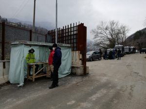 Finito questo utile iter, si arriva al ponte sul Clarea con i propri mezzi dove però è stato montato il solito cancello a protezione di “non si sa cosa” che permette l’accesso solo a piedi. Il riconoscimento dei proprietari avviene prima di varcare il cancello (dove ci sono una dozzina di carabinieri) da parte di un rappresentante della questura che fa firmare alcuni fogli; poi l’ing. Polazzo chiede i nominativi e controlla su un suo elenco l’ora di convocazione e accompagna al di là del cancello dove, al posto del gazebo usato normalmente per l’apericena No Tav del venerdì, si trova un check-point per misurare la temperatura e sottoscrivere una dichiarazione ai sensi del protocollo anti-Covid.