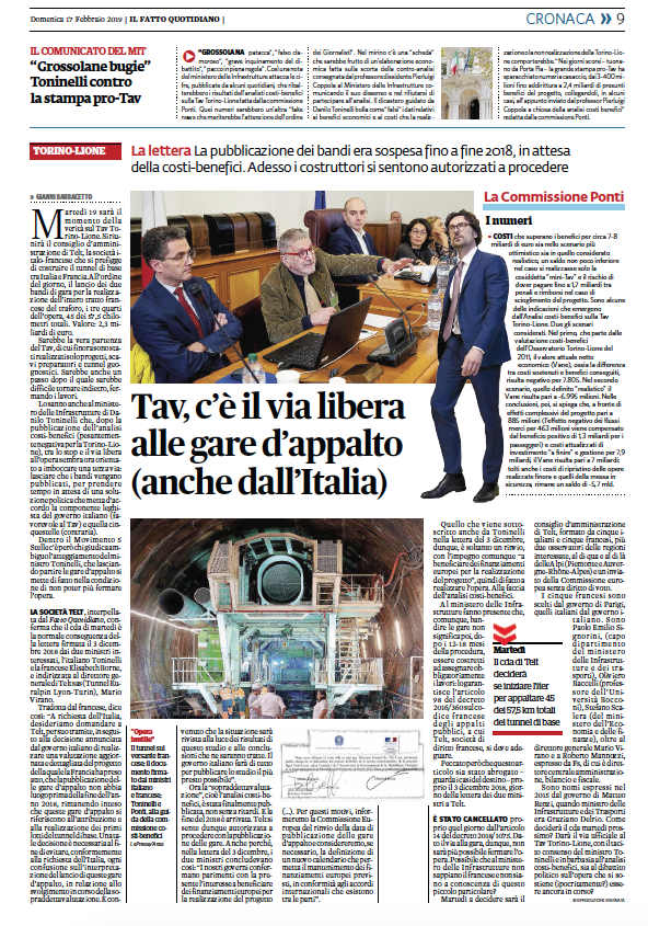 Ora la “sopraddetta valutazione”, cioè l’analisi costi-benefici, è stata finalmente pubblicata, non senza ritardi. E la fine del 2018 è arrivata. Telt si sente dunque autorizzata a procedere con la pubblicazione delle gare. Anche perché, nella lettera del 3 dicembre, i due ministri concludevano così: “I nostri governi confermano parimenti con la presente l’interesse a beneficiare dei finanziamenti europei per la realizzazione del progetto (…). Per questi motivi, informeremo la Commissione Europea del rinvio della data di pubblicazione delle gare d’appalto e considereremo, se necessario, la definizione di un nuovo calendario che permetta il mantenimento dei finanziamenti europei previsti, in conformità agli accordi internazionali che esistono tra le parti”.