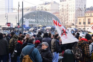 Ma mentre Monti trova un teatrino propenso per la sua campagna elettorale abbracciandosi con l’amministratore delegato di Trenitalia e il Ministro del Lavoro Fornero, anche lei presente all’inaugurazione, molti tra NoTav, studenti, disoccupati e sindacati di base hanno voluto dare il loro benvenuto all’ennesima farsa. In circa 250 hanno quindi deciso di contestare la recita di inaugurazione della stazione, vista dalle lobby siTav come un grande successo del Tav. Al grido di “Monti e Moretti, truffatori perfetti” il presidio si è spostato per circa un’ora in diversi punti fuori dalla stazione, completamente blindata dentro e fuori -comprese le vie laterali limitrofe- e con la fermata della metro Porta Susa soppressa durante la mattinata per l’occasione. Quando il corteo ha tentato di entrare all’interno della stazione, la prevedibile reazione della polizia di Fassino è stata repentina, caricando il corteo dividendolo in due parti. Il bilancio delle violenti cariche sono numerosi feriti e due giovani studenti fermati, rilasciati in un secondo momento. Dopo le cariche, i manifestanti sono riusciti a ricompattarsi, presidiati da un numero ingente di camionette di polizia e carabinieri che in un certo momento hanno tentato anche di accerchiare il presidio che si era ricompattato. L’inaugurazione blindatissima, è peraltro in linea con quanto dichiarato tempo fa dal questore di Torino Faraoni, che affermò che nel 2012 oltre l’80% delle forze di polizia sono state impiegate in servizi di ordine pubblico nel Torinese per eventi connessi alla linea ad alta velocita’ Torino-Lione.