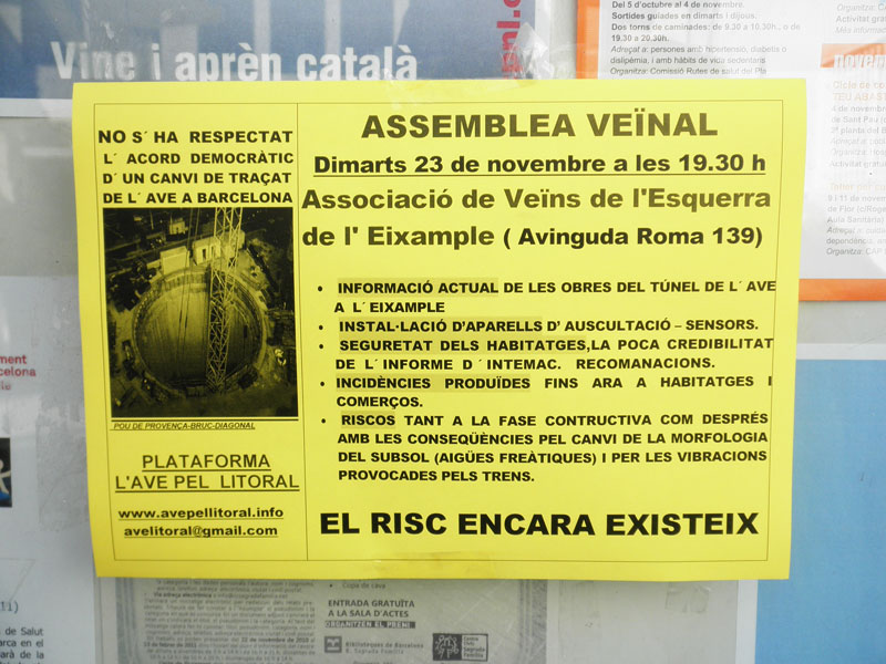 Pubblichiamo una foto inviataci da un amica di Barcellona (che ringraziamo) di uno dei tanti manifestini affissi a Barcellona in novembre riguardante la richiesta popolare di conoscere meglio i danni dell’alta velocità che dovrà passare sotto la città.E’ ‘in lingua catalana ma si capisce abbastanza