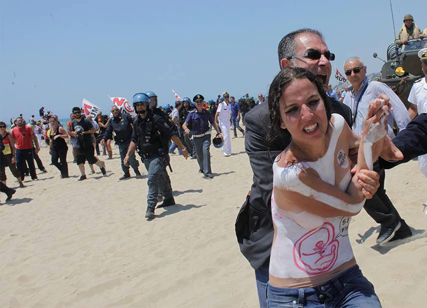 All’arrivo della parata il presidio ha sbarrato la strada coi propri corpi, ribadendo il proprio rifiuto alle politiche imperialiste americane e alle imposizioni statunitensi in termini di basi militari, devastazione del territorio e pericoli per la salute.