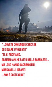 Se poi i poliziotti devono per forza difendere le recinzioni con idranti e lacrimogeni, non pretendano che le persone restino immobili a subire le loro violenze… Dopotutto, nessuno li ha obbligati a guadagnarsi il pane difendendo il malaffare che vuole distruggere a spese di tutti (anche loro) la nostra valle. E non si preoccupino, che le loro richieste/minacce di un “pugno maggiormente duro” contro i No Tav non otterrà l’effetto di terrorizzarci, come non lo hanno ottenuto i fogli di via, i mesi di galera, le denunce e le ferite di Yuri, di Luca e di tutti gli altri che devono portare sul proprio corpo i segni della brutalità loro, perpetrata in valle per conto della casta dei politici, dei mafiosi e dei banchieri… Una cosa insomma è certa: se ve ne andrete, nessuno in valle vi rimpiangerà; e siamo sicuri che, con ciò che qui state facendo, un po’ di disprezzo lo troverete per voi anche nel resto d’Italia!