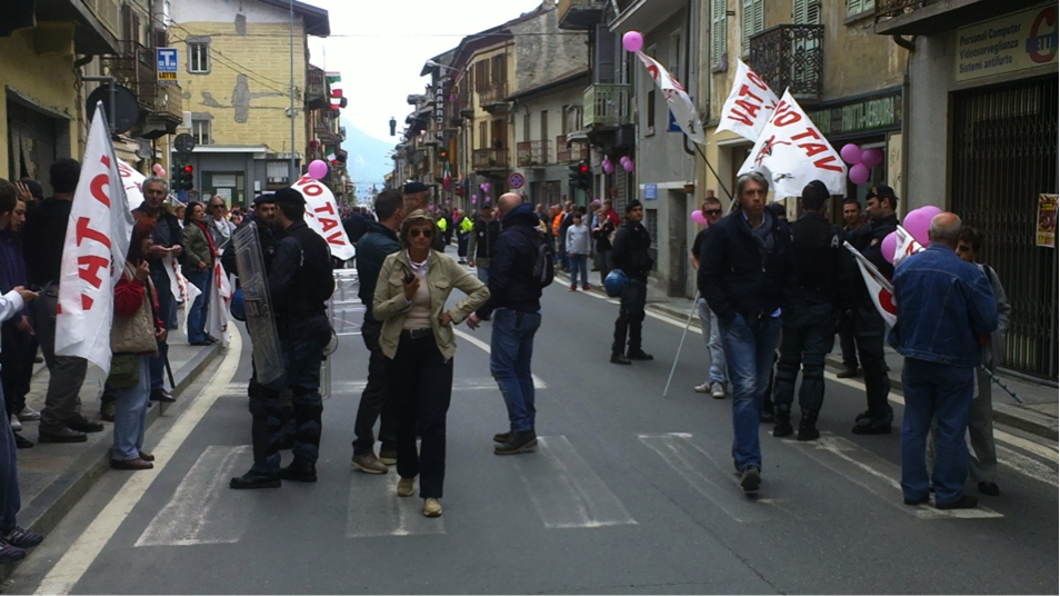 Non chiediamo dibattiti sulla TAV durante un “processo alla tappa”, ma il rispetto di quello che siamo e quindi il non oscuramento delle bandiere e nemmeno l’oscuramento della militarizzazione del territorio, degli agenti, polizia e carabinieri, in tenuta antisommossa che hanno presidiato a Bussoleno Via Traforo: ennesima esibizione di muscoli inutili, perché nessuno voleva ,sventolando le bandiere, bloccare il Giro.