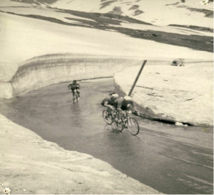 Foto in bianco e nero di belle giornate, di persone che non ci sono più, di ciclisti impegnati sulle salite dei mitici colli: Iseran, Izoard, Lautaret , Galibier; a volte tra alte pareti di neve.