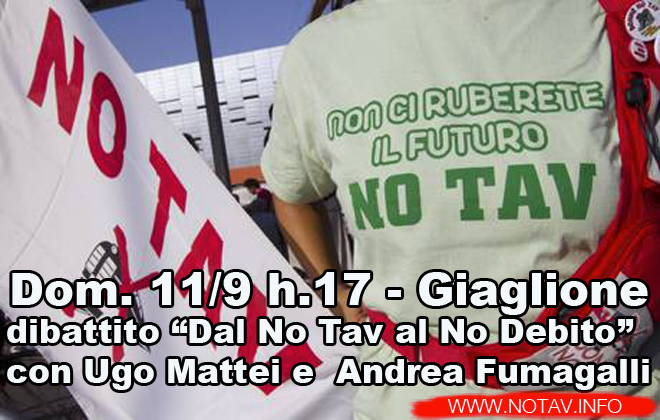 – Domenica 11 Settembre – Giaglione ore 17.00: dibattito “Dal No Tav al No Debito”con Ugo Mattei e Andrea Fumagalli