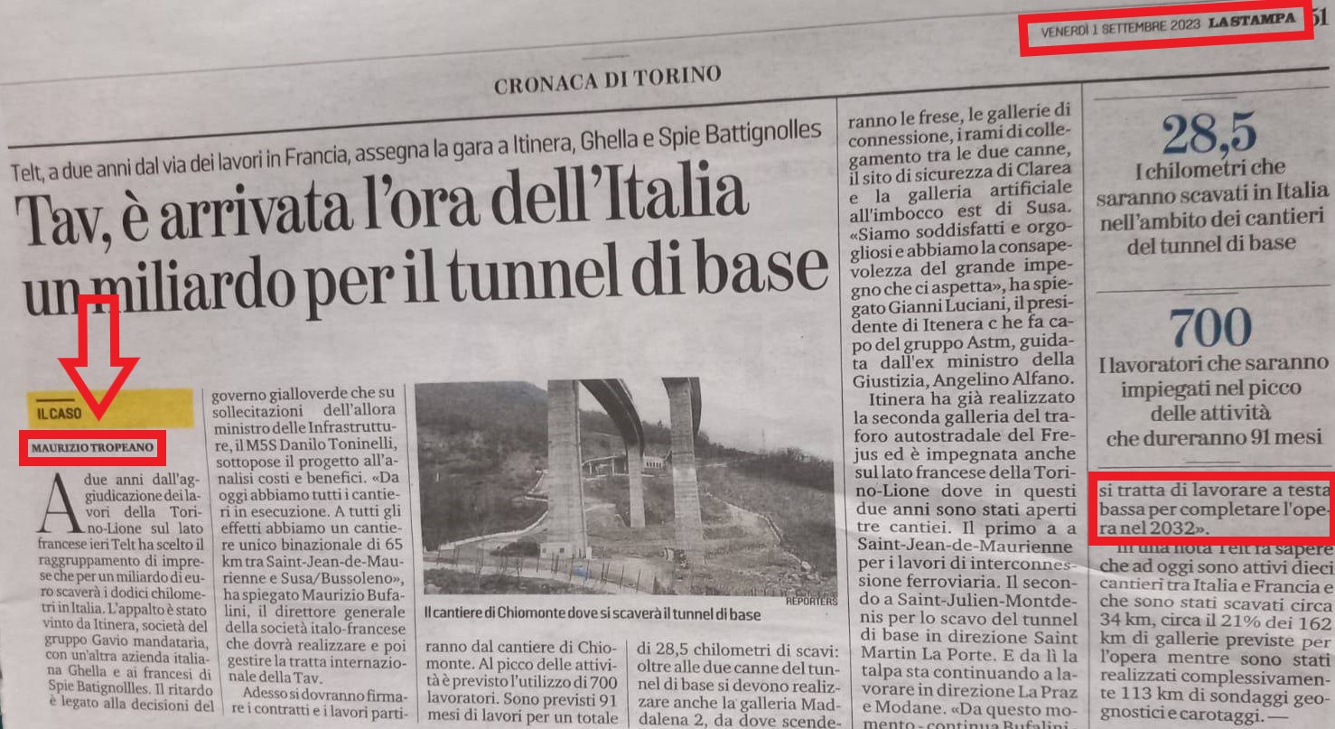“Tav, è arrivata l’ora dell’Italia, un miliardo per il tunnel di base” Così titolavano i giornali alcuni giorni fa. E’ sempre il quotidiano torinese la Stampa a dare grande lustro e risalto alle balle ad alta velocità relative alla Torino Lione TAV alta velocità. Sono passati ormai 20 anni ma la brillante firma di Tropeano non si smentisce. TELT parla e La Stampa scrive sbandierando date e successi a cui nessuno crede più. Sembra la trama di un film ma è vita vera e mangiatoia pura. Ecco che dunque a distanza di 20 anni gli stessi attori continuano imperterriti a riprodurre slogan senza neanche più un filo di pudore o vergogna che sia. Per puro caso o forse no la firma è la medesima, molti altri invece sono passati a miglior vita.