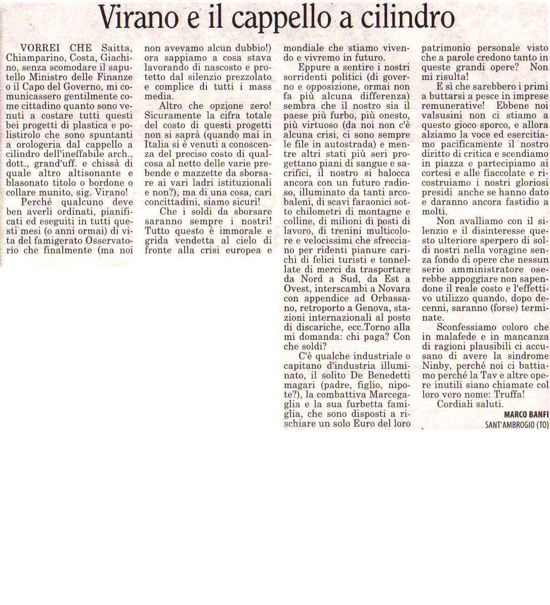 Vorrei che Saitta, Chiamparino, Costa, Giachino, senza scomodare il saputello ministro delle finanze o il capo del governo, mi comunicassero gentilmente come cittadino quanto sono venuti a costare tutti questi bei progetti di plastica e polistirolo che sono spuntati a orologeria dal cappello dell’ineffabile arch. dott., grand’uff. e chissà di quale altisonante e blasonato titolo e bordone o collare munito, sig. Virano!