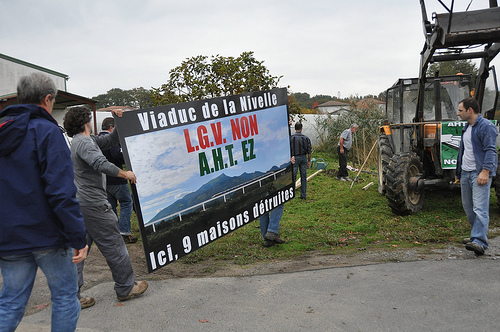 Cinquanta persone hanno apposto due cartelloni giganti sulla strada da Saint Jean de Luz – Ascain all’altezza delle serre di Beñat Lecuona, agricoltore e membro della AMAP, sul prato di una casa destinata ad essere distrutta come altre 8 che la circondano se il progetto di TAV sarà realizzato.