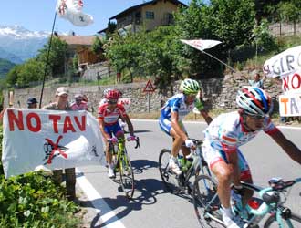 Ieri giovedì 20 luglio il movimento no tav ha così salutato anche il tour de France che passava da Pinerolo. Partendo già da Cesana Torinese i no tav hanno esposto bandiere e striscioni al passaggio dei ciclisti. Una giornata anche questa per comunicare le ragioni della lotta no tav, con volantini ed interventi che hanno spiegato la situazione della Val di Susa. Numerosi sono stati gli appuntamenti sportivi a cui il movimento ha partecipato cercando di legare la passione per lo sport alla difesa del territorio. All’arrivo a Pinerolo le bandiere hanno invaso l’arrivo dei ciclisti che simpaticamente hanno salutato i no tav.